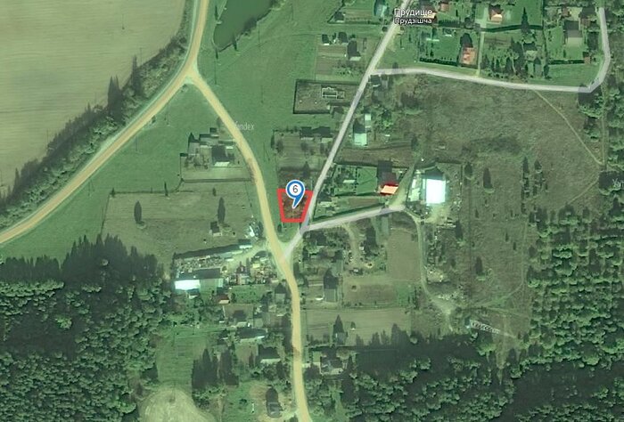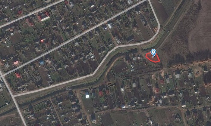 Участок выделен на пустыре, в низине, в непосредственной близости от жилых домов. За территорией земельного надела простирается поле, ближайшие участки также распродается через аукцион. Рядом имеется небольшой канал. Сам участок ровный, но низкий, поэтому, скорее всего, в дождь на площадке будет стоять вода. Подъезд — накатанная дорога. Из коммуникаций в деревне есть газ, электричество и водопровод.