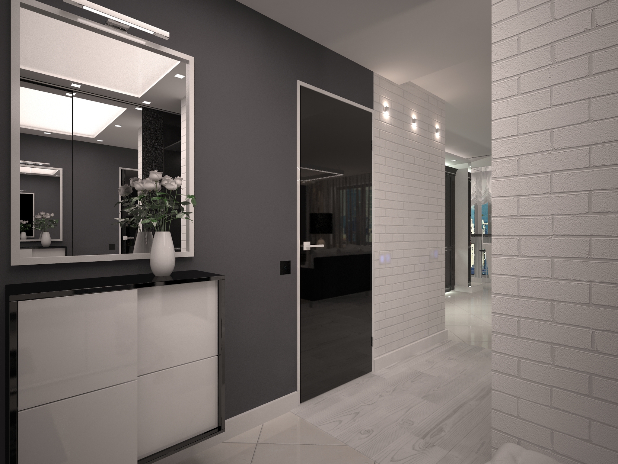 Первая квартира, о которой пойдет речь, состоит из совмещенных между собой «трешки» и «однушки». Изначально для оформления этого пространства была выбрана неоклассика. Главное предпочтение, высказанное клиентами — это много белого цвета. Причем никаких оттенков слоновой кости или бежевого, идеальный белый цвет. Сразу отмечу, что руководила ремонтом жена, что будет очень заметно в интерьере. В качестве акцентного цвета был выбран черный, но его в квартире очень мало.