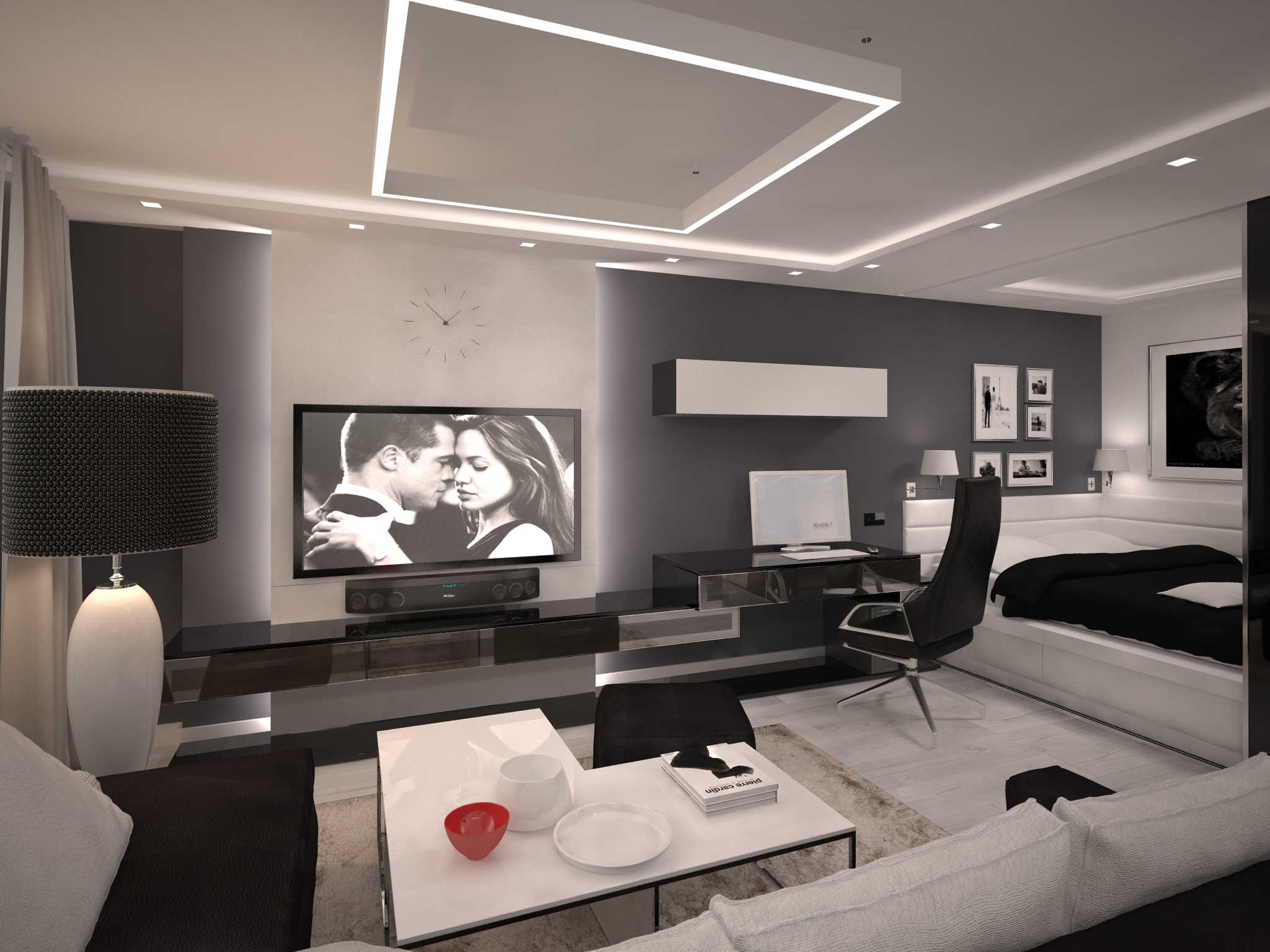 — Второй интерьер также черно-белый, но вы сейчас увидите глобальную разницу, так как в создании этого интерьера принимал активное участие мужчина. Здесь прослеживается явное доминирование. В этом варианте главным цветом становится черный, а для обозначения акцентов — белый. Кстати, жесткие, темные оттенки выбирают чаще мужчины. В данной квартире всего несколько чисто женских деталей: зеркало с подсветкой для визажа и люстра в кухне изогнутой формы.