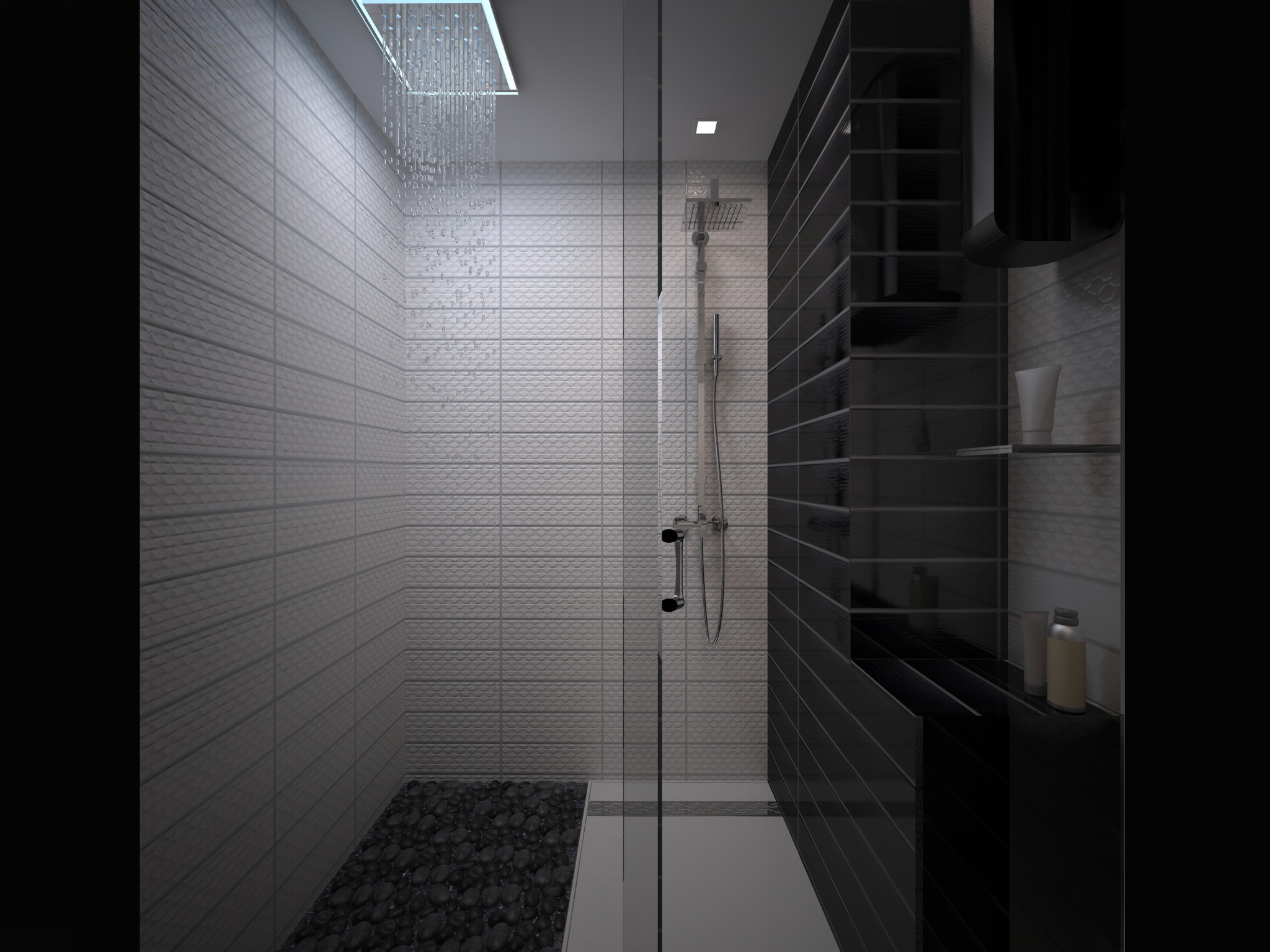 В ванной комнате заказчики попросили сделать два душа: один стандартный, а второй тропический, который предполагает камешки на полу и лейку, как дождь. Это просил супруг. Зеркала здесь без рисунков, простые.