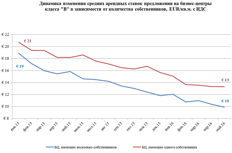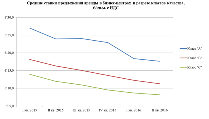 Актуальные ставки предложения аренды в начале июня были на уровне 17 EUR/кв. м. с НДС для класса «А», 11 EUR/кв. м. с НДС для класса «В» и 8 EUR/кв. м. с НДС для класса «С».