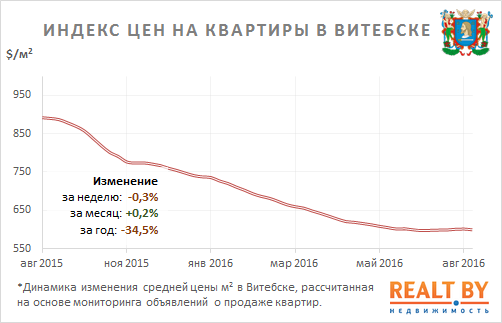 За неделю с 8 по 15 августа 2016 года информационно-аналитическим центром Realt.by были отмечены следующие изменения на вторичном рынке жилья города Витебска: