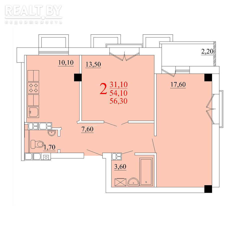 2-комнатные от 56 м2 — $ 44,8 тыс.