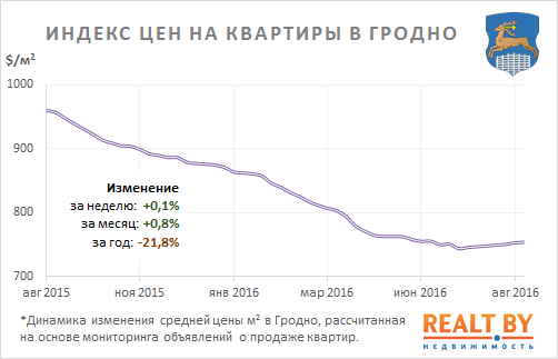 За неделю с 15 по 22 августа 2016 года информационно-аналитическим центром Realt.by были отмечены следующие изменения на вторичном рынке жилья города Гродно:
