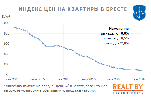 Средняя цена предложения в объявлениях о продаже квартир в Бресте на минувшей неделе не изменилась и составила 773 $/м2.