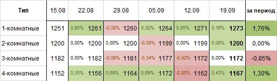 Цены на различные типы квартир за неделю претерпели следующие изменения: