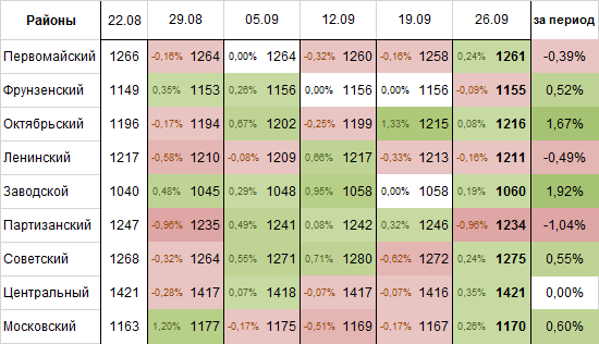 У шести районов города по итогам минувшей недели была отмечена положительная динамика цен. Впрочем, нигде рост цен не превышал 0,4%. Среди районов, где цены на квартиры снижались, выделяется Партизанский с показателем -1%. Также снижение цен было зафиксировано в Ленинском (-0,2%) и Фрунзенском (-0,1%) районах.