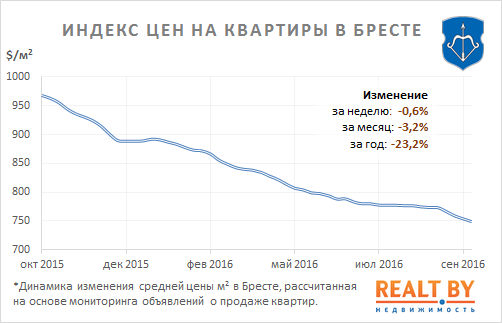 Средняя цена предложения в объявлениях о продаже квартир в Бресте на минувшей неделе снизилась на 0,6% и составила 749 $/м2.