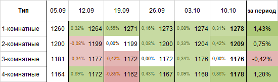 Цены на различные типы квартир за неделю претерпели следующие изменения: