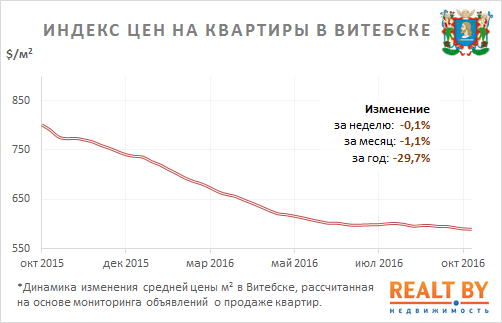 Средняя цена предложения в объявлениях о продаже квартир в Витебске на минувшей неделе снизилась на 0,1% и составила 589 $/м2.