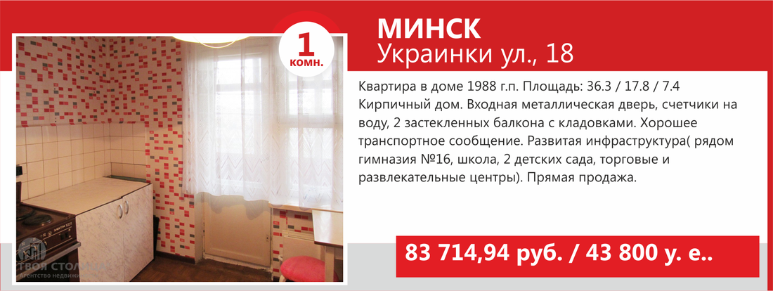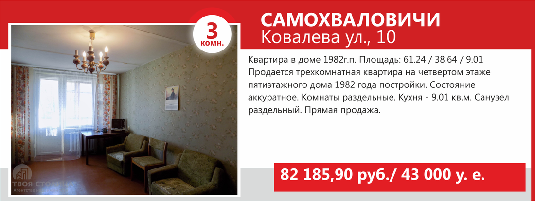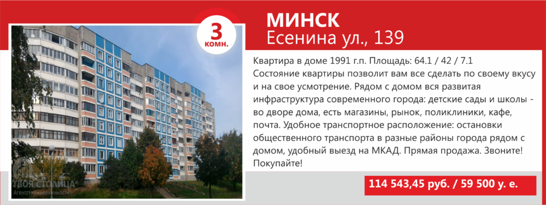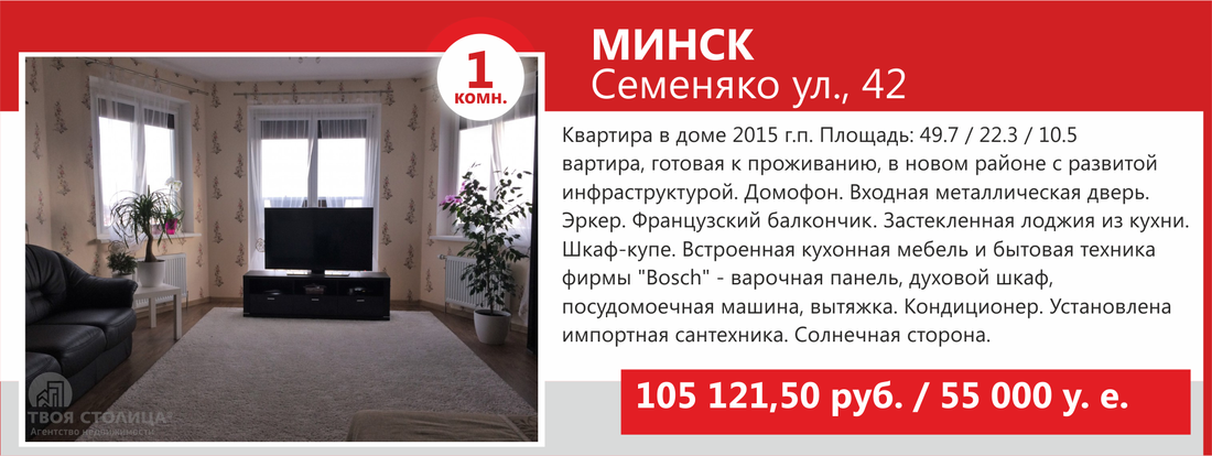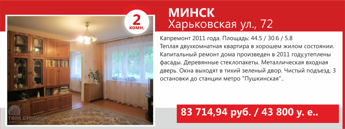 — Сегодня в большинствe заявок, которые мы получаем, фигурируют запросы на квартиры стоимостью $ 40−50 тысяч, — говорит заместитель директора по продажам на вторичном рынке жилья агентства недвижимости «ТВОЯ СТОЛИЦА·АГЕНТСТВО НЕДВИЖИМОСТИ» Светлана Куделко. — И если в конце 2015 года за эту сумму мы могли предложить только однокомнатные квартиры в Минске, то теперь покупатели, имеющие на руках $ 50 000, рассматривают приобретение двух- - трехкомнатных квартир в столице и ближайшем пригороде.