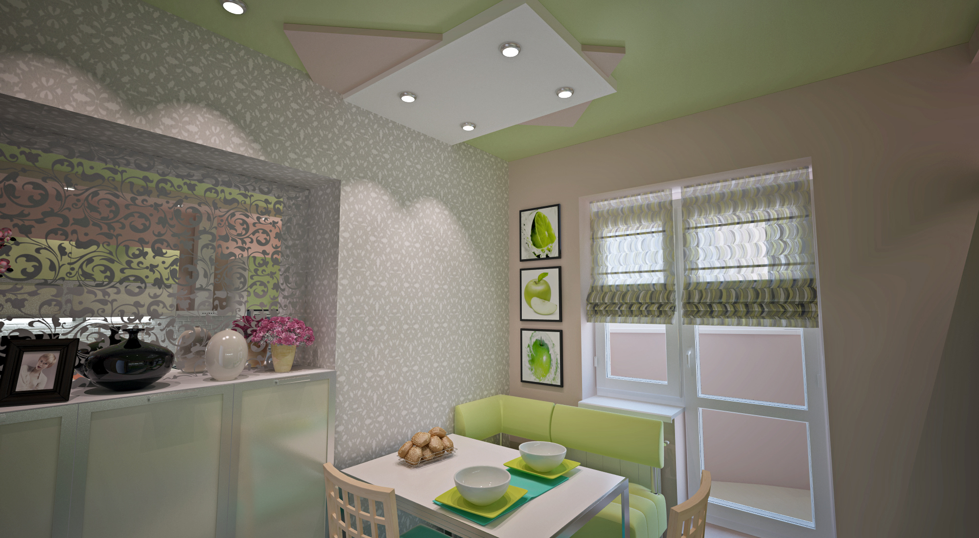 — Переходим к нашей главной комнате, где нам необходимо было разместить спальное место, рабочую зону, место для рукоделия, зону TV и гостевой диван. Мы решили заказать кровать с подиумом, внутри которого будет зона для хранения постельного белья. Чтобы спальное место было комфортными, мы решили прибегнуть к мягкому изголовью. Вокруг кровати установлены деревянные полки, где также можно хранить вещи, использовать их как стол или, положив на поверхность подушки, как скамью для гостей. Спальное место мы визуально отделили интересными бусами.