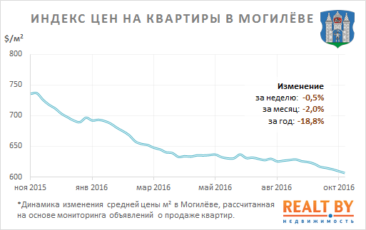 Средняя цена предложения в объявлениях о продаже квартир в Могилёве на минувшей неделе снизилась на 0,5% и составила 607 $/м2.