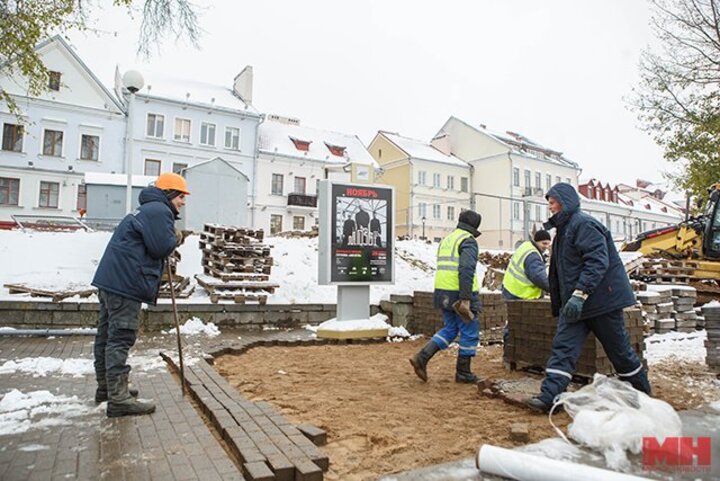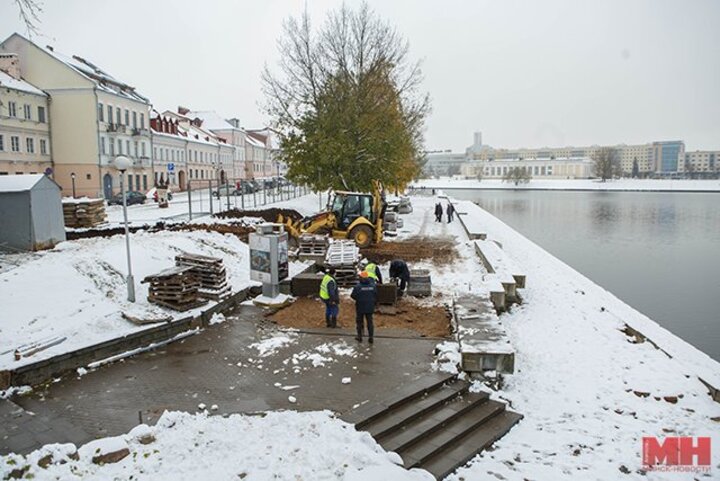 Началась реконструкция набережной Свислочи возле ст. метро «Немига». На участке между ул. Богдановича и Островом слез, протяженность которого более 370 метров, демонтируют плитку и устанавливают строительное ограждение.