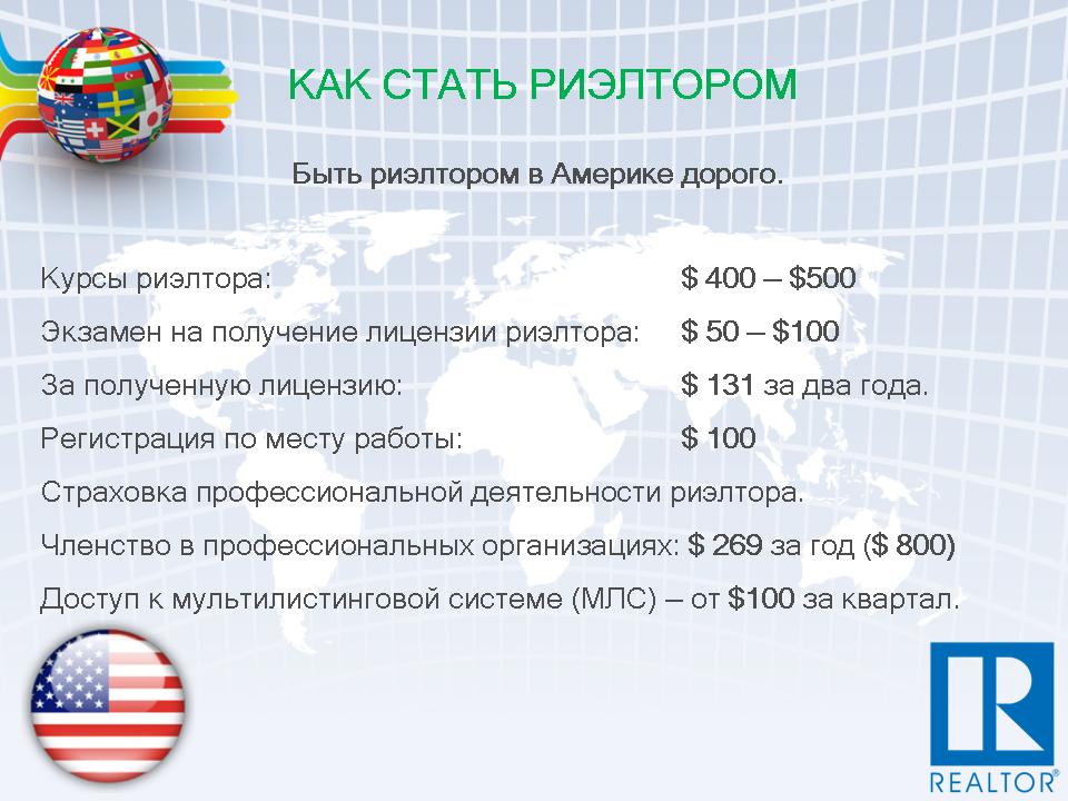 Американец-претендент должен пройти обучение на специальных курсах. Потом ему предстоит экзамен на получение лицензии, регистрация по месту работы, страховка своей профессиональной деятельности, оформление членства в профессиональной организации, получение доступа к мультилистинговой системе. Конечно, все это не бесплатно, но все четко регламентировано и, видимо, того стоит. Риэлтер в США — популярная и уважаемая профессия.