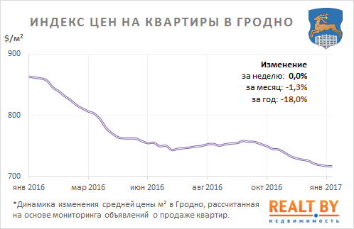 Средняя цена предложения в объявлениях о продаже квартир в Гродно на минувшей неделе не изменилась и составила 717 $/м2.