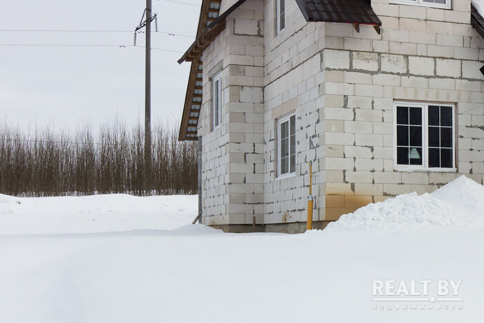 Очередной участок выделен в квартале новой коттеджной застройки в агрогородке Новоселье. Площадка ровная, но заросшая кустарником. Подъезда к территории нет. Из коммуникаций имеется только электричество. Справа от участка — жилой дом, земельный надел слева пока пустует. Большинство соседей в квартале строится.