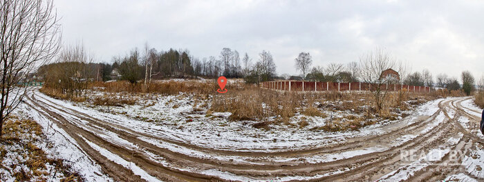 Участок выделен в квартале новой коттеджной застройки. Сосед справа строится, площадка слева пока пустует. Подъездные пути — накатанная дорога. Из коммуникаций есть только электричество. Территория участка ровная, удобная для строительства. Из минусов — приближенность к железнодорожным путям и вид на производство.