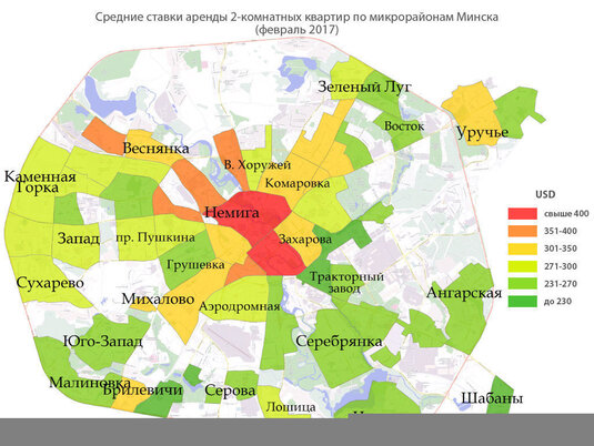 Так выглядит ситуация с арендными ставками в микрорайонах Минска по результатам февраля:
