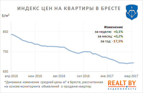 Средняя цена предложения в объявлениях о продаже квартир в Бресте на минувшей неделе выросла на 0,1% и составила 695 $/м2.