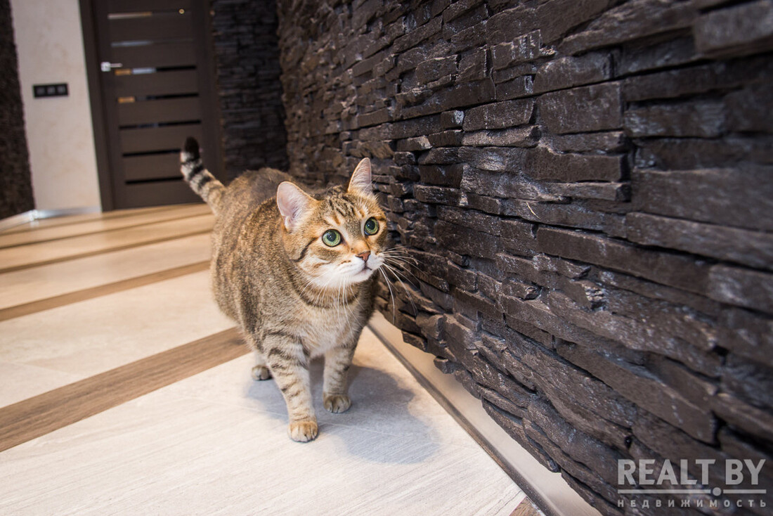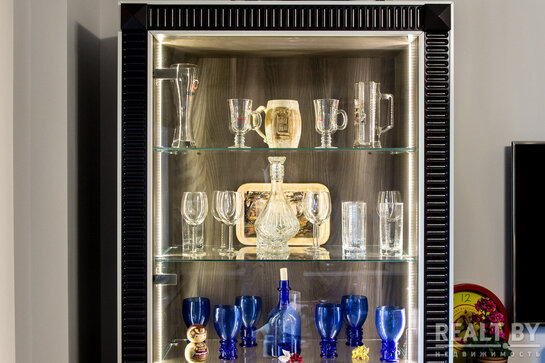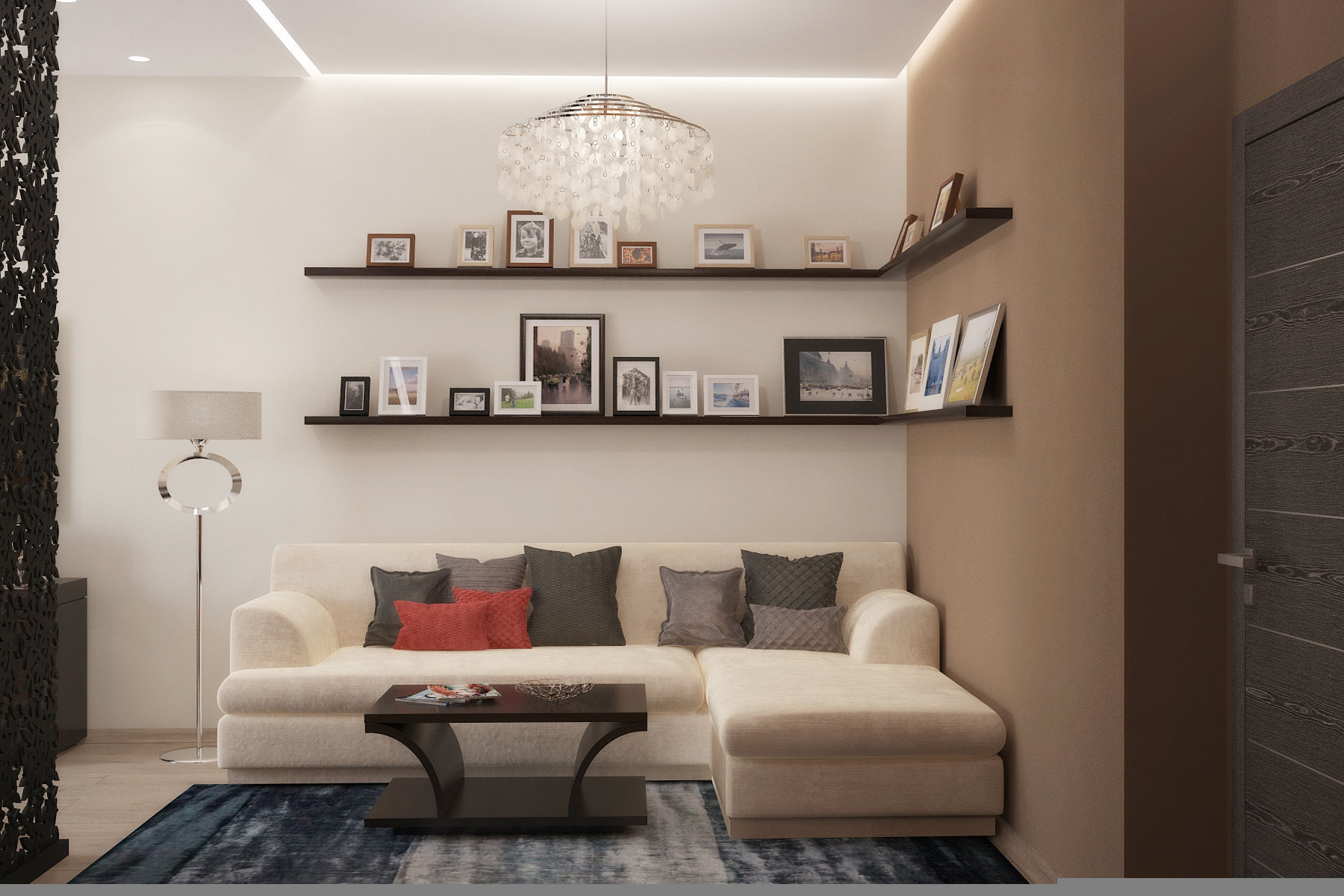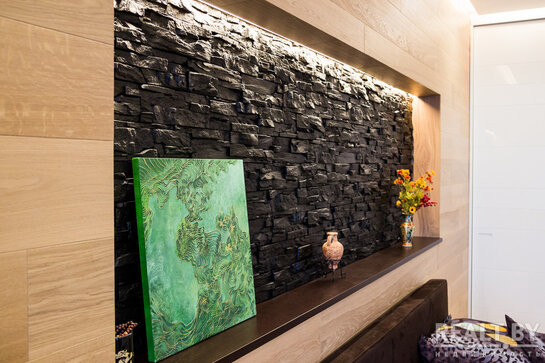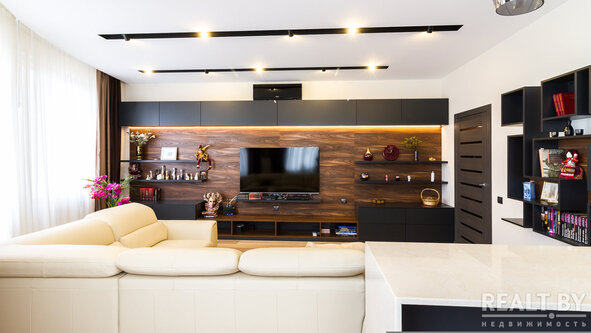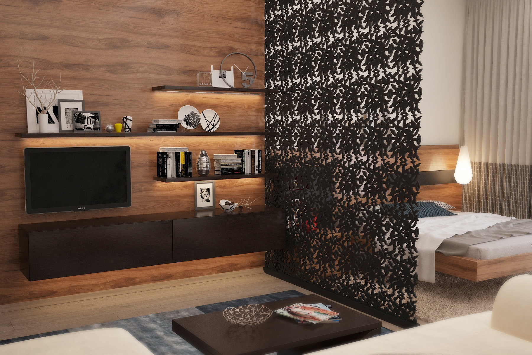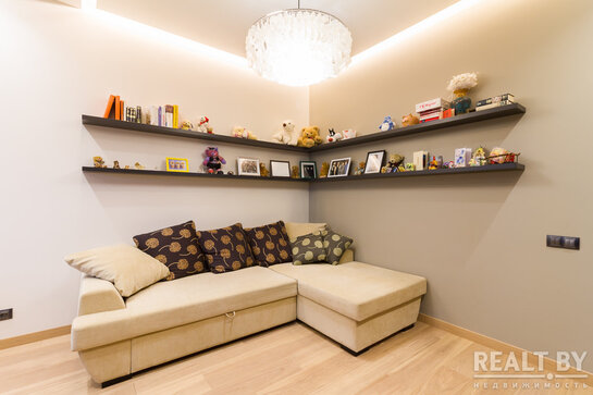 Комнату разделили на две части с помощью стеклянной перегородки, рисунок на перегородке разрабатывался студией самостоятельно. В зоне отдыха был вписан тот самый диван, который владельцы привезли со старой квартиры. Напротив него — зона TV, а также место для хранения дисков, которых здесь несметное множество. Люстра фабрики Verpan датского дизайнера и архитектора Вернера Пантона в этой части комнаты очень выделяется оригинальностью.