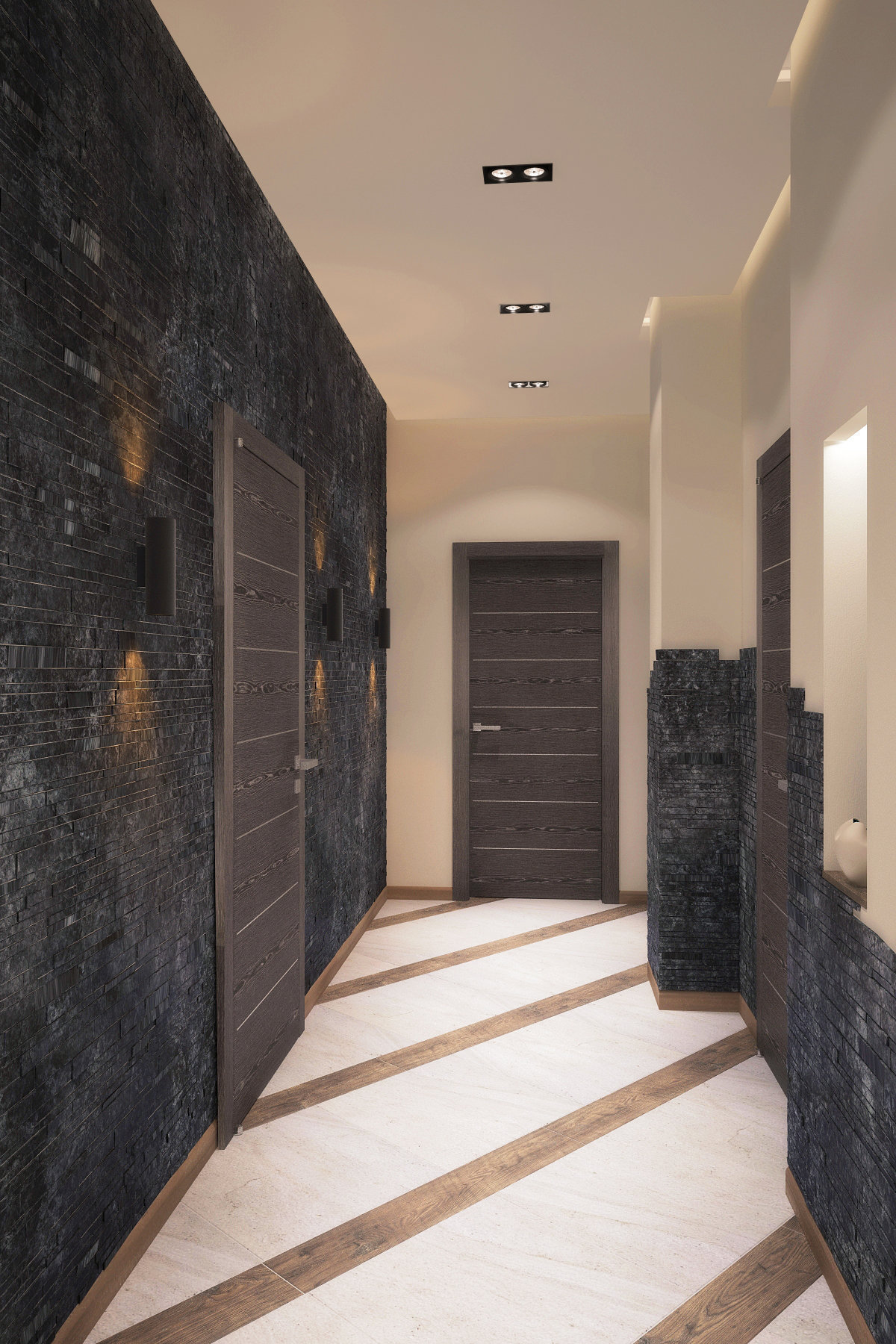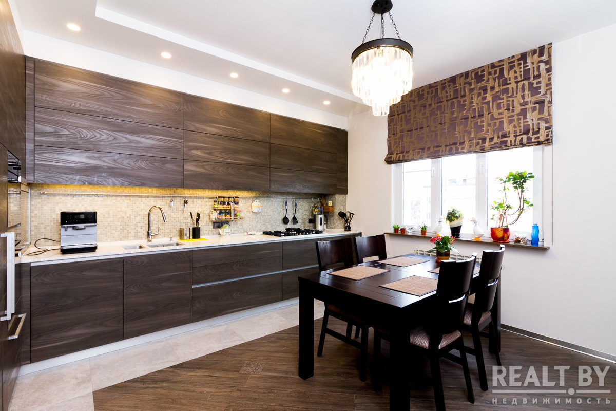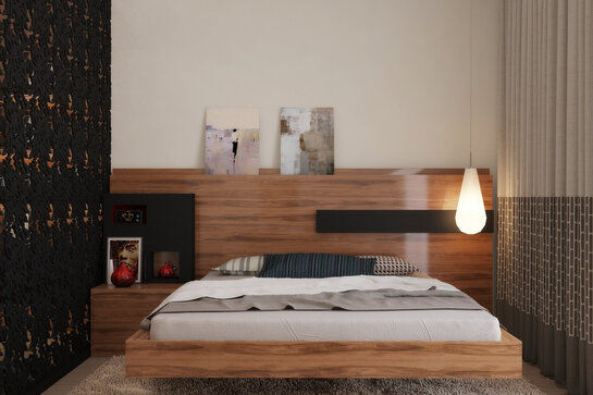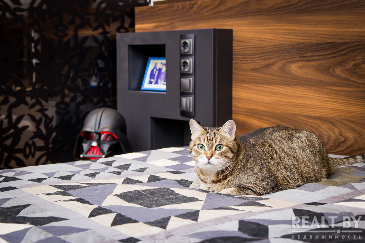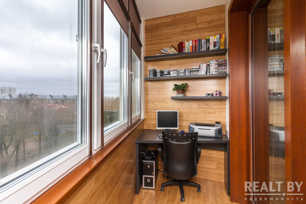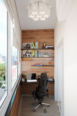 Строение кровати выполнена таким образом, что мы не видим ножек кровати, их просто нет! Кровать «парит» над полом. Далее, фасад кровати выполнен из ДСП с текстурой дерева. Та же она повторяется на спинке и прикроватной тумбочке. Акцентами мебельной композиции выступают грифельно-серые вкрапления, в качестве открытых и закрытых полок, которые мы видели в гостиной. Опять же, сплетение комнат между собой. Балкон был утеплен, оформлен в паркет. Здесь создана рабочая зона.