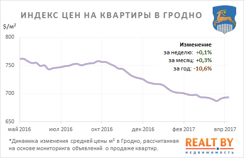 Средняя цена предложения в объявлениях о продаже квартир в Гродно на минувшей неделе выросла на 0,1% и составила 693 $/м2.