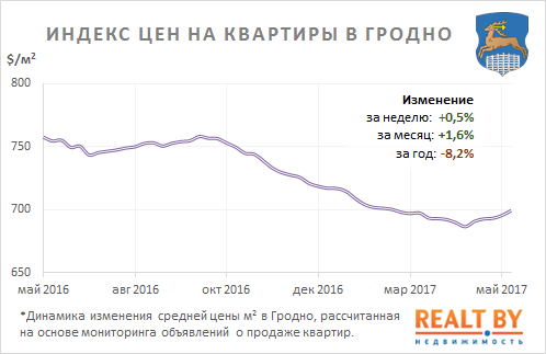 Средняя цена предложения в объявлениях о продаже квартир в Гродно на минувшей неделе выросла на 0,5% и составила 700 $/м2.