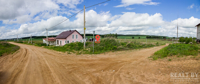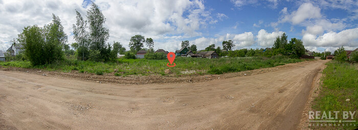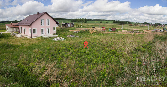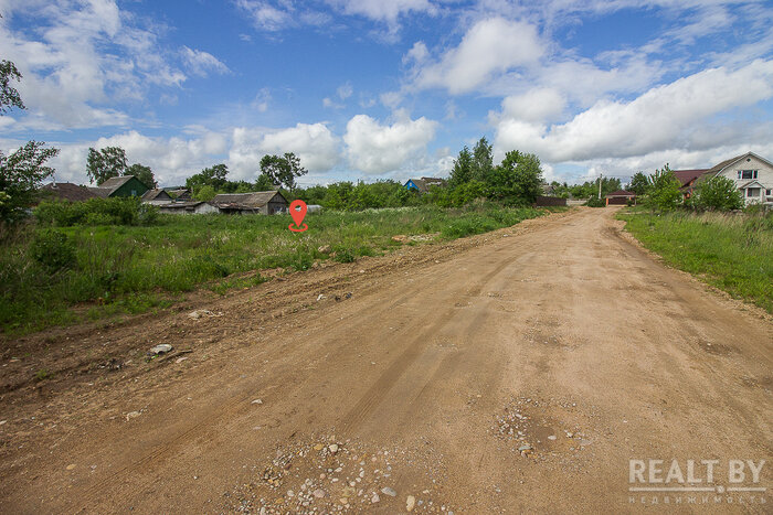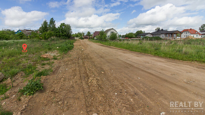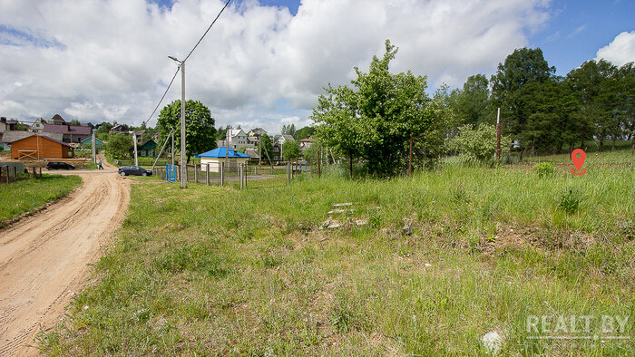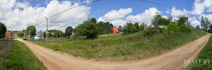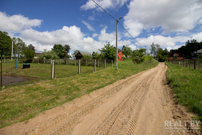Участок ровный, огорожен. Слева — жилой дом, справа — техническая площадка. Подъезд — асфальтированная дорога, лишь последние 100 метров надо проехать по гравийке. К участку проведены все коммуникации — электричество, газ и водопровод. Рядом проходит железная дорога, поэтому на площадке может быть довольно шумно. Из преимуществ — приближенность к Заславскому водохранилищу.