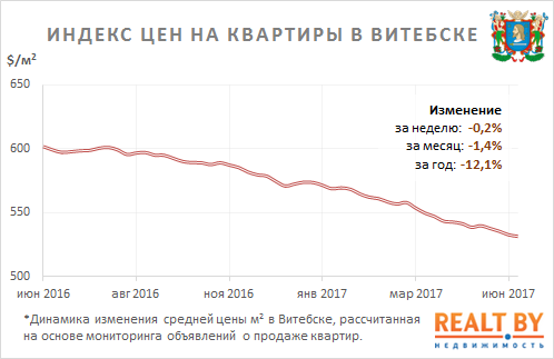 Средняя цена предложения в объявлениях о продаже квартир в Витебске на минувшей неделе снизилась на 0,2% и составила 532 $/м2.