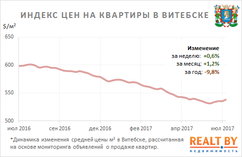 Средняя цена предложения в объявлениях о продаже квартир в Витебске на минувшей неделе выросла на 0,6% и составила 539 $/м2.
