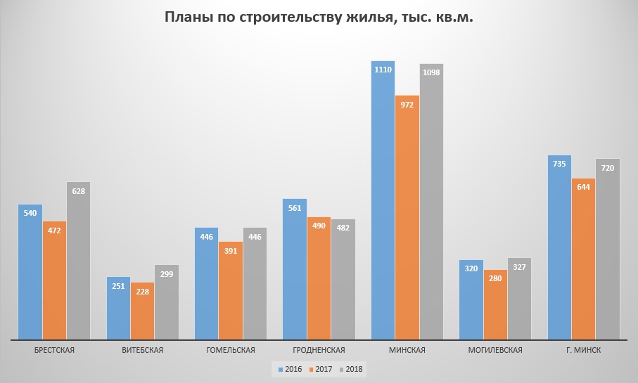 В 2018 году всем областям Беларуси, кроме Гродненской области, увеличены задания по вводу общей площади жилья. Больше всего это коснулось Брестской области, которой задание увеличено на 156 тыс. кв.м.