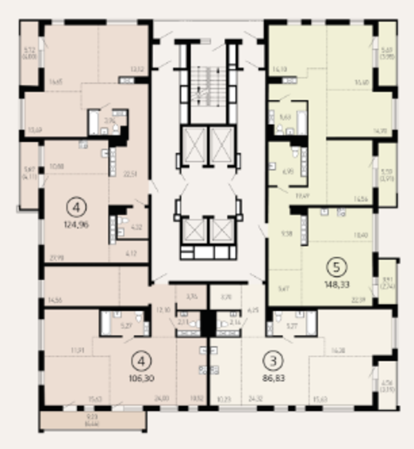 Верхние этажи (22-й и 23-й) дома № 4 Квартал-парка практически полностью отданы под 4- и 5-комнатные квартиры. К примеру, «четырёшка» на 106,30 квадратного метра оценена девелопером в $ 137 800, что составляет $ 1296 за «квадрат».