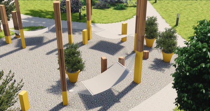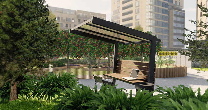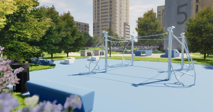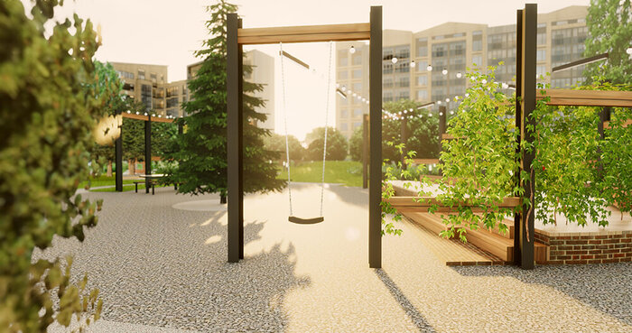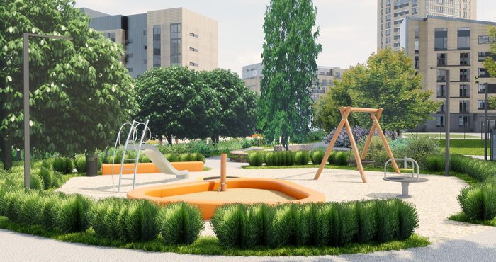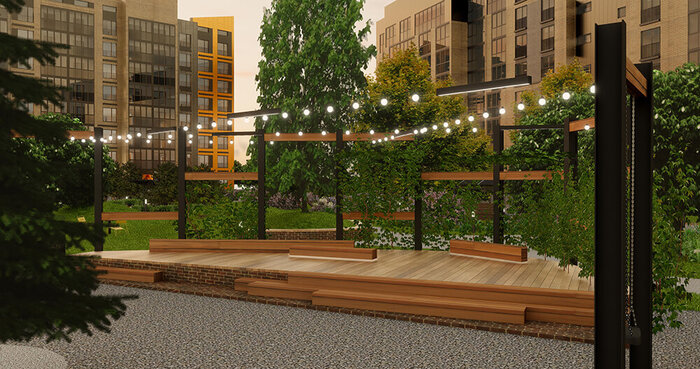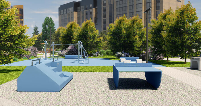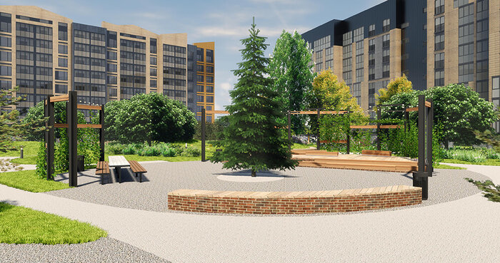 Вместо парковки в огромном дворе на 2,5 гектара разобьют парк со множеством зелени, зонами отдыха, главной площадью, детскими и спортивными площадками. Среди других новшеств «А-100» — мини-огороды и воркаут-зона с настольным теннисом, кикером и другими игровыми видами спорта. Жители Квартал-парка смогут работать прямо во дворе в зонах с USB-разъёмами и бесплатным Wi-Fi. Двор осветят светодиодами, а скамейки оснастят солнечными панелями. В парк посадят уже взрослые деревья, поэтому гулять в нём можно будет сразу по окончании строительства.