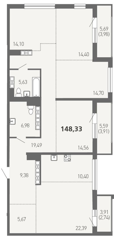 Самые дорогие квартиры в подъезде расположены на верхних 22-м и 23-м этажах. Это просторные 5-комнатные евроквартиры, где планировка отдана на усмотрение хозяина, а кухня и гостиная объединены. Квартира занимает 148,33 квадратного метра. Желающему приобрести её придётся отдать застройщику $ 192 400. Владелец 5-комнатной квартиры купит её по цене «квадрата» $ 1297.