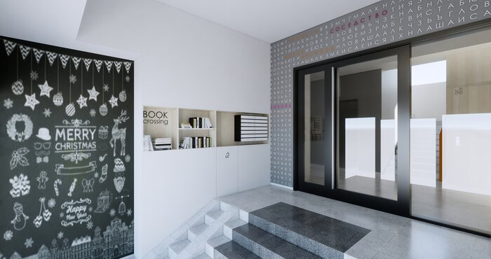 В доме № 4 Квартал-парка будет всего 1 подъезд — зато целых 23 этажа, на которых разместятся 165 квартир. В подъезде установят 4 лифта: по 2 пассажирских и грузовых. В вестибюле оборудуют лобби с интерьером кофейни: в «А-100» рассчитывают, что в лобби жители дома смогут общаться с соседями, читать книги и листать журналы, смотреть футбольные матчи или оставлять сообщения на меловой доске. Помимо лобби, в доме запроектированы детская комната и тренажёрный зал. В вестибюле установят лапомойку для собак.