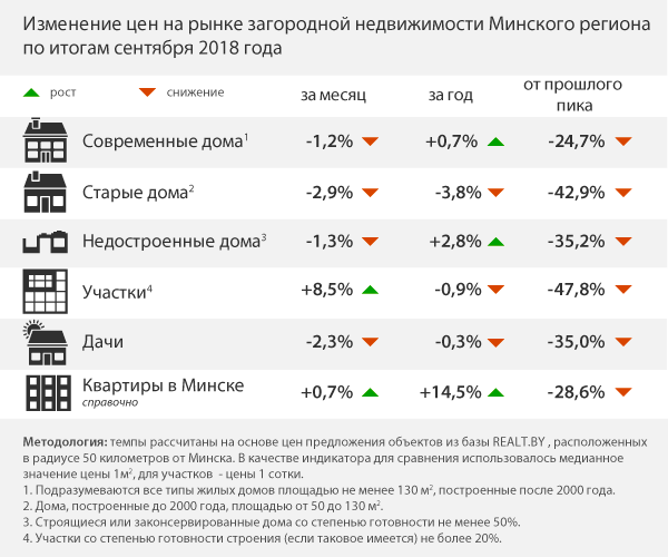 Общий рост во многом обеспечивают дачи и построенные до 2000 года жилые дома. Другой небезынтересный факт заключается в том, что излишек предложения активнее формируется по мере удаления от кольцевой. Так, в радиусе 10 километров от МКАД предложение выросло за год на 8%, в зоне 10−25 км — на 16%, в зоне 25−50 километров — сразу на 21%. Очень существенный разброс и по направлениям: на Пуховичском направлении предложение за год выросло на 27%, в то время как на Логойском динамика была нулевой.