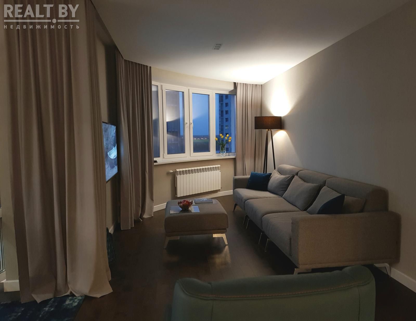 Первый жилой небоскреб по минским меркам. Но квартиры там почему-то не пользовались спросом. 34-этажное здание компания «Итерабелстрой» начала возводить в далеком 2009 году, и лишь в июне 2015-го покупатели получили ключи. По последним данным, высота здания со шпилем — 134 метра. В комплексе продается всего лишь одна квартира, которая подходит под наши параметры.
