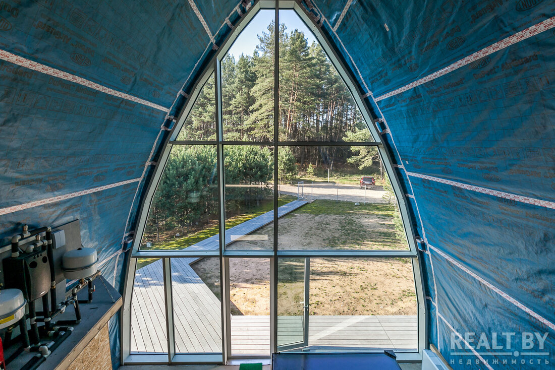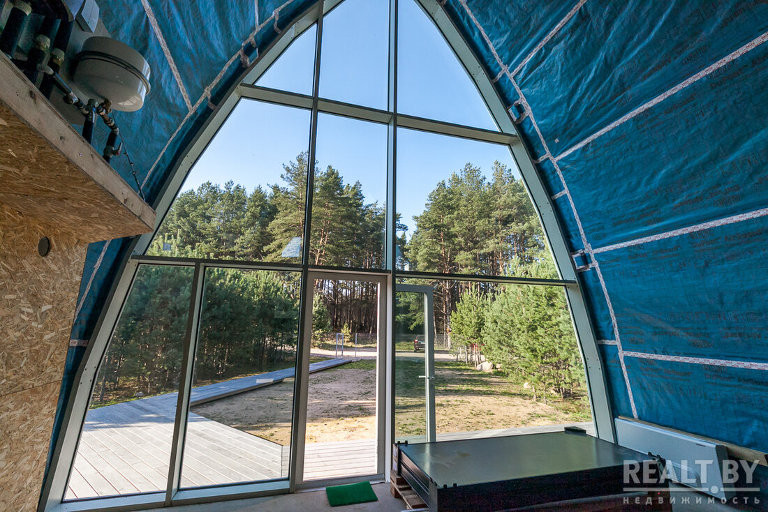 Планировка предусматривает 2 спальни, 2 санузла и одно общее пространство: кухню-гостиную с панорамным остеклением. В гостиной можно сделать камин (все выводы сделаны заранее). При желании здесь даже можно проводить концерты — акустика в доме впечатляет.