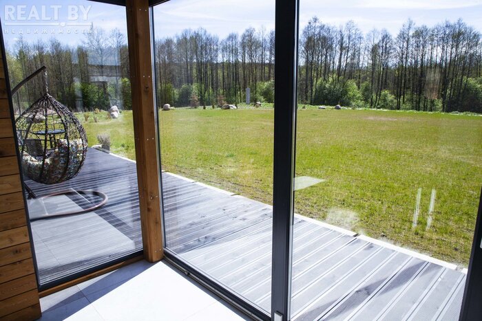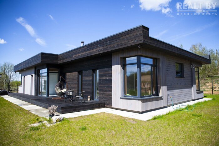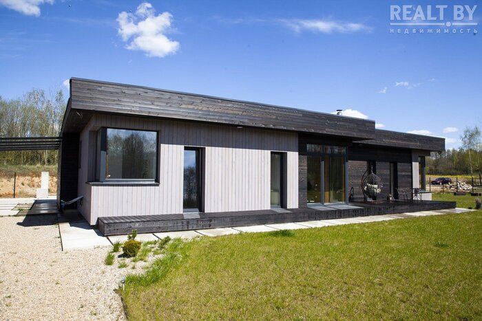 Проект, по словам Ольги, предложила одна из белорусских строительных фирм, они и возводили дом. Общая площадь коттеджа — 162 «квадрата». Сюда входит кухня-гостиная (55,8 кв. м), три жилые комнаты (15,1−16,8 кв. м), в одной из которых есть собственная ванная комната и гардеробная. В прихожей есть гардероб, а с одной террасы, пройдя через навес для автомобиля, можно попасть в 2 кладовые комнаты. Есть еще одна большая терраса с другой стороны дома.