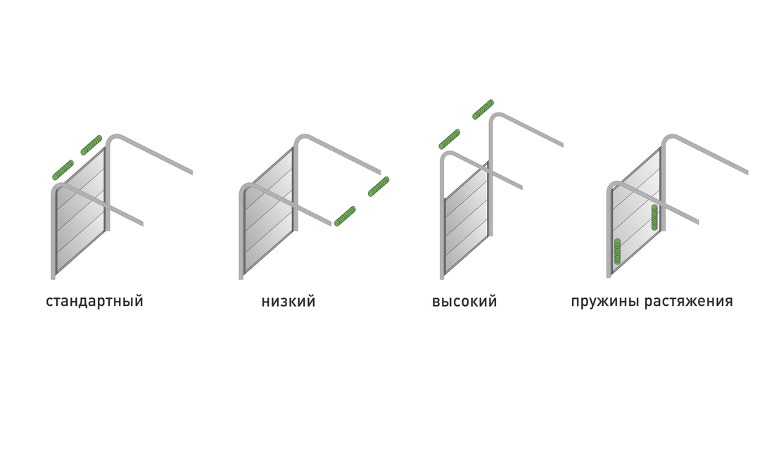 Хотя справедливым будет отметить, что секционные ворота можно устанавливать и в гаражах с очень низкими и очень высокими потолками, небольшой перемычкой и даже без нее. Для этого существуют низкий, высокий монтаж, а также монтаж с пружинами растяжения.