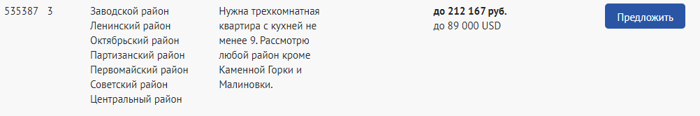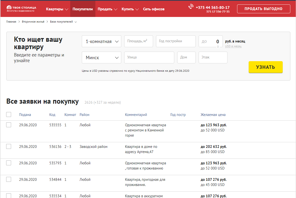 Оценить спрос на конкретный объект в режиме реального времени можно с помощью сервиса «Декларированный спрос». По сути, это уникальная база клиентов, оставивших свои заявки на приобретение недвижимости — квартир, домов, новостроек — в «ТВОЯ СТОЛИЦА. АГЕНТСТВО НЕДВИЖИМОСТИ». Сейчас в ней более 2600 запросов на покупку. Заявки от покупателей могут быть как универсальными, например, трехкомнатная квартира в определенном ценовом диапазоне в любом районе Минска, так и индивидуальными, когда клиенту необходима покупка квартиры в конкретном доме.