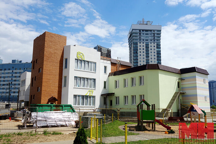 К строительству детсада приступили в августе прошлого года, а к началу августа планируют завершить работы. СУ-201 Стройтреста № 35 трудится здесь круглосуточно. Здание остеклено, фасады обрели яркое убранство. Сейчас строители заканчивают внутреннюю отделку, обустраивают игровые площадки с верандами. Началась поставка и монтаж мебели и оборудования.