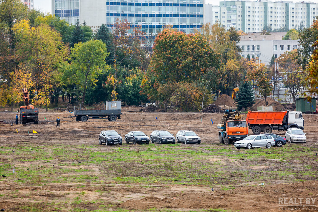 В марте мы писали, что площадку под строительство Национального футбольного стадиона уже практически подготовили. Для будущего грандиозного спортивного объекта пришлось вырубить часть деревьев в парке 50-летия Октября. Сейчас на строительной площадке заметно оживление — сюда пригоняют технику, ставят вагончики для строительного городка.