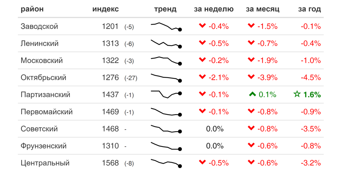 Для Фрунзенского и Советского районов неделя прошла без изменений, в остальных районах цены на квартиры снизились. Максимальные темпы снижения цен были отмечены в Октябрьском районе столицы (-2.1%).