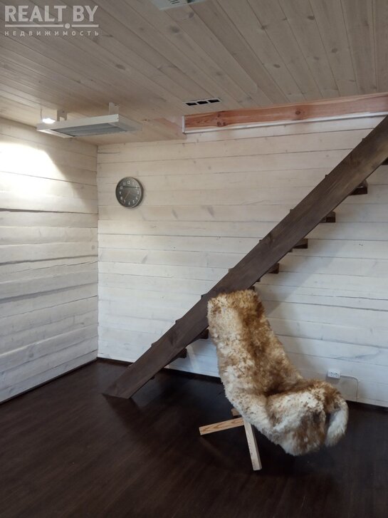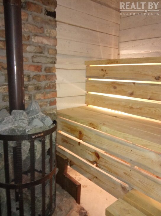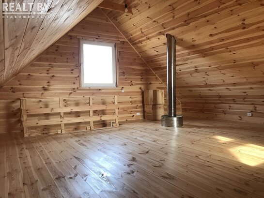 Деревянный дом состоит из двух этажей, общая площадь которых — 34 «квадрата». Автор объявления пишет, что в доме установлены стеклопакеты, а пол, перекрытия и крыша утеплены. Внутри постройка оснащена инфракрасными батареями, работающими от сети. Кроме того, оба уровня обогреваются от камина. Приятный бонус — небольшая сауна, которая расположена прямо в доме.