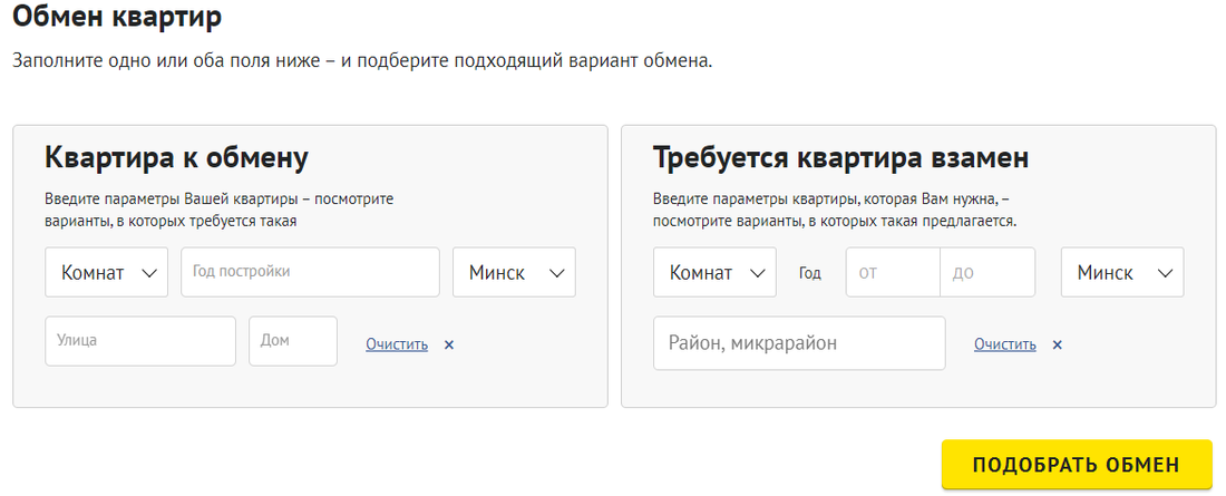 Сервис удобен в использовании: просто введите параметры вашей квартиры и параметры недвижимости, которую вы ищете взамен, и получите пул подходящих объектов с фото и видеообзорами.