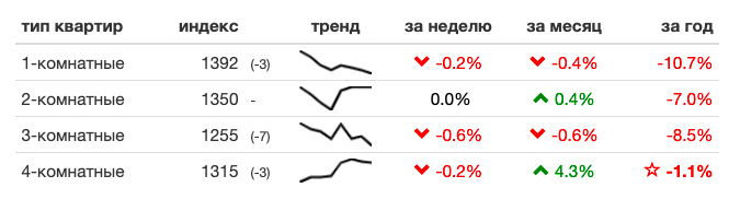 Среди типов квартир преобладало небольшое снижение цен. Наиболее заметное у «трёшек» — минус 0.6% за последние 7 дней.