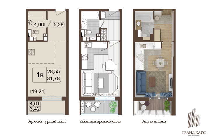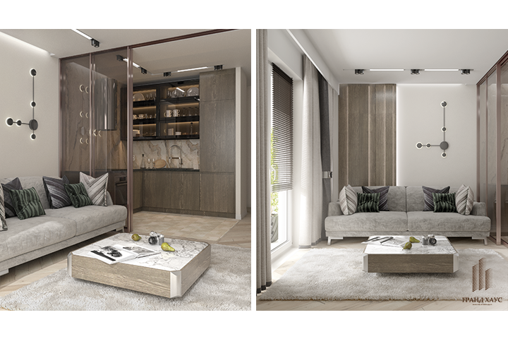 В квартирах небольшой площади важно максимально рационально использовать пространство, выделяя при этом отдельные функциональные зоны. В нашем случае предусмотрено разделение зон кухни и спального места с помощью тонированной стеклянной перегородки. Квартиры сдаются со свободной планировкой и черновой отделкой, высота потолков 2,7 метра. К моменту сдачи в квартирах установлены радиаторы KERMI, счетчики воды и пожарные извещатели, в лоджиях предусмотрено панорамное остекление