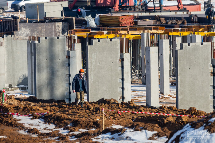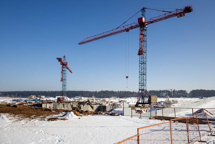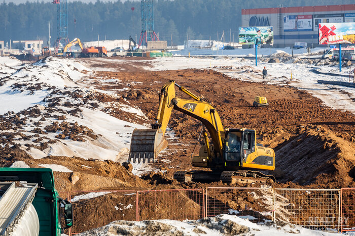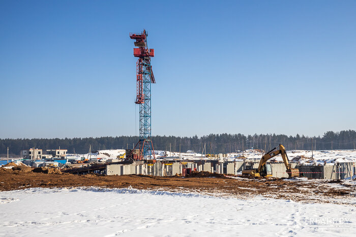 На участке работают несколько кранов и команда рабочих, а очертания первых домов уже показались из-под земли.